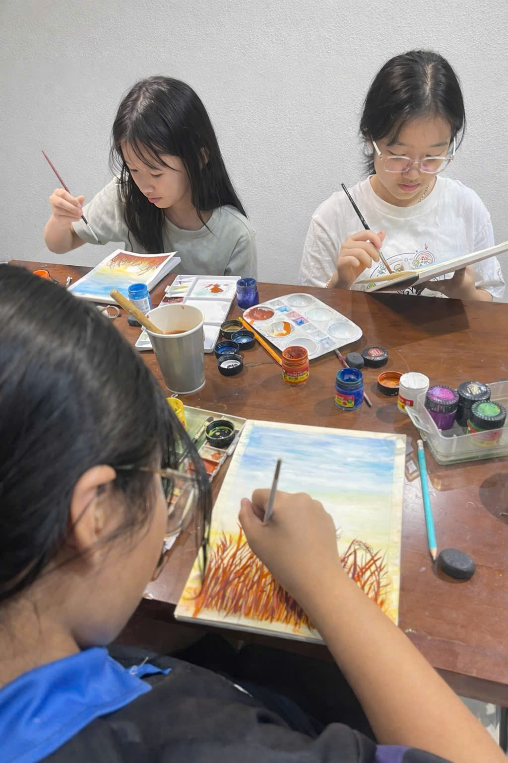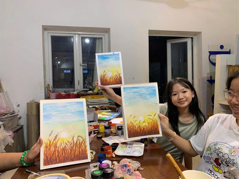 Buổi học màu nước hôm nay thật đặc biệt.Mỗi bức tranh là một góc cảm nhận rất riêng của các họa sĩ nhí Tinkle về buổi chiều hoàng hôn lãng mạn, nơi những hàng cỏ lau nhẹ nhàng đung đưa trong gió.